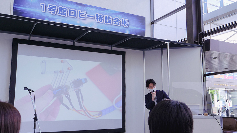 神戸で行われた、企業や大学、研究機関などが集う「国際フロンティア産業メッセ2022」に初めて出展。ロボメイツを紹介するブースでロボット教材の実演を交えながらプレゼンテーションを行ったところ、ロボットメーカーをはじめさまざまな企業が関心を示してくださり、特許戦略についてアドバイスをいただくなど非常に成果の多い展示会となりました。