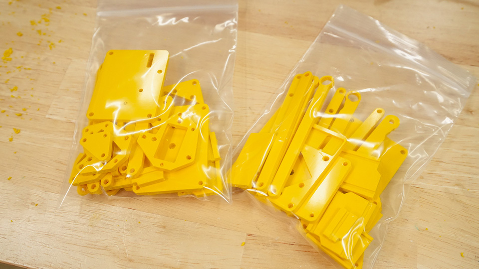 イベント用のロボット教材準備にあたっては、産技短大の二井見教授と、エアグラウンドにアルバイトとして来ている同大の学生・上村さんに、企画から設計、製作まですべてにご尽力いただきました。材料を用意し、機械で切り出し加工して、手作業でパーツを分け、一つ一つの袋詰めまで行い、オリジナル教材を準備してくださったのです。