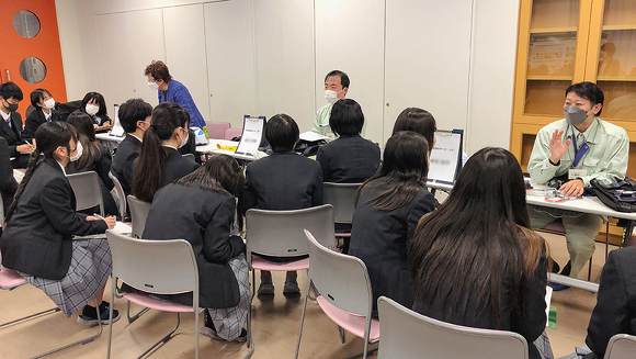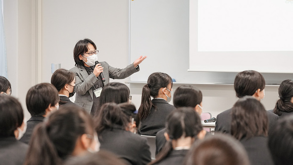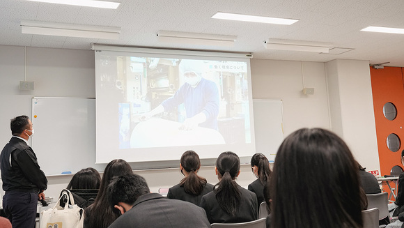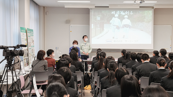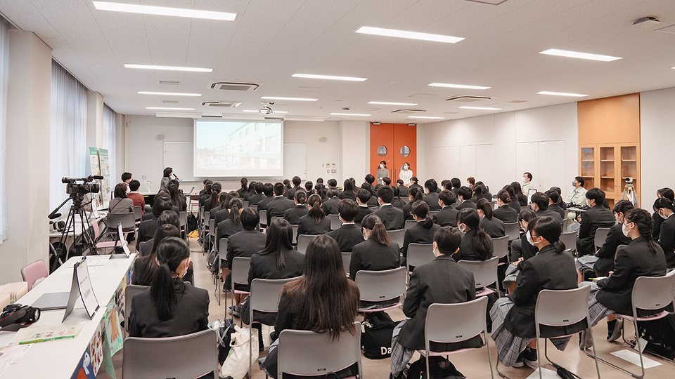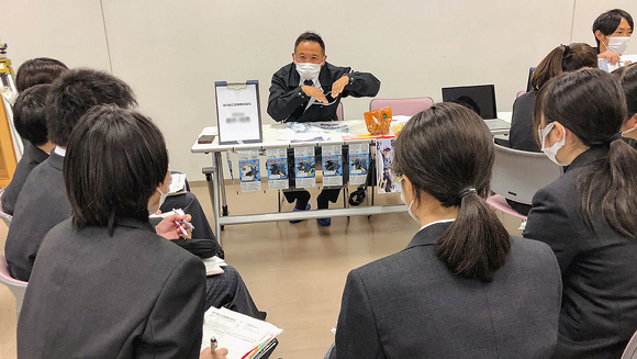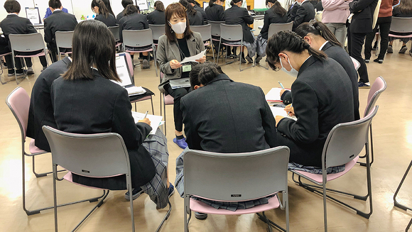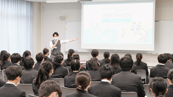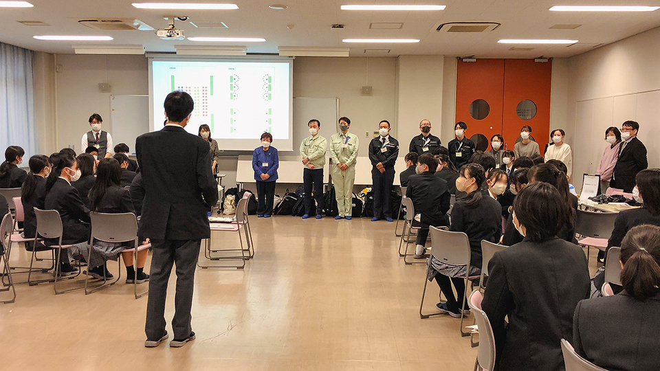 また、2021年度は3年生を対象にしましたが、2022年度は高校卒業後の進路を1年生のうちから考え、進級時に就職か進学かクラスを選択するため、対象を1年生に変更。11月の開催当日は商業学科の生徒80人と教職員が参加し、大きな会議室で行いました。