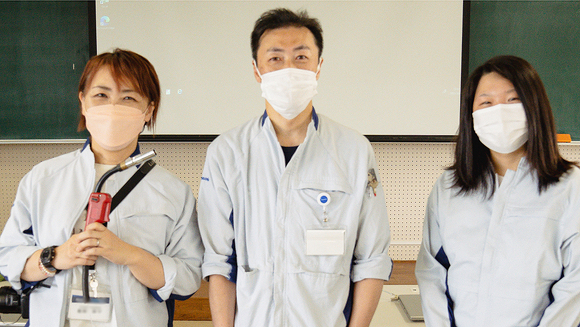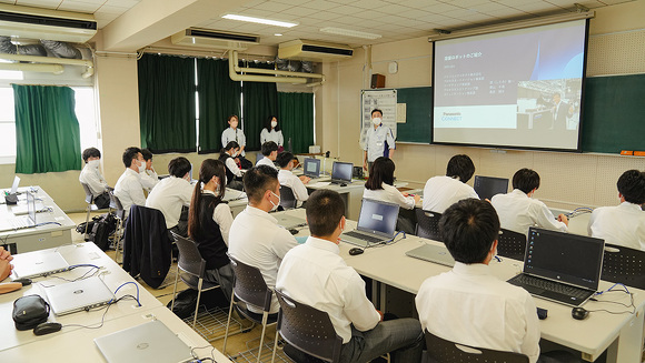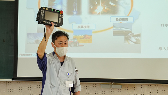 10月には、ロボットの開発・製造・販売などを手がける「パナソニック コネクト」様による出張授業が実現しました。3人の社員さんがお越しくださり、ティーチング・ペンダントというコントローラーなど仕事道具の実物を見せながら、同社のロボットが活躍した実績や業務内容を紹介。溶接ロボットが工場で稼働する動画の上映や、入社3年目の若手エンジニアさんによるロボット開発の仕事内容のお話もありました。