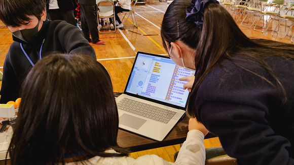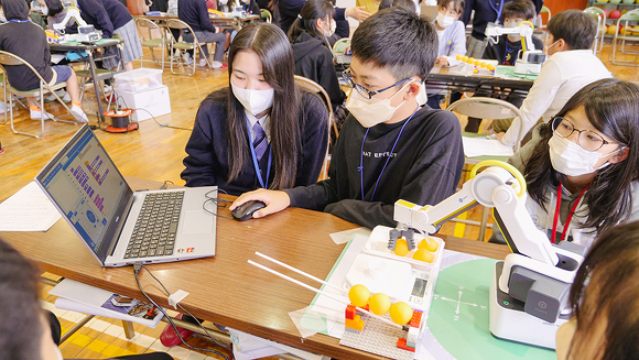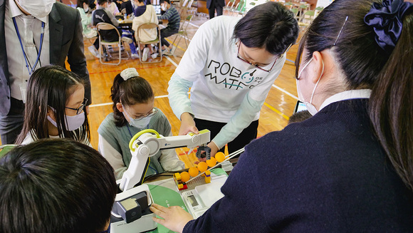 小学生はグループに分かれて交替でプログラミングを行い、高校生がサポートする中、次々とみかんまんじゅうに見立てたピンポン玉を箱に詰めていきました。