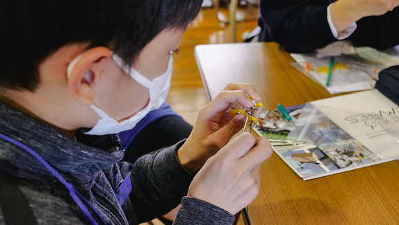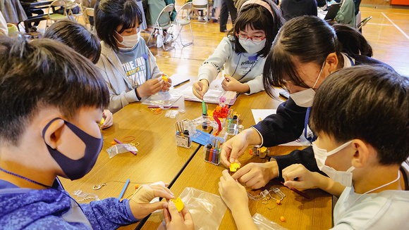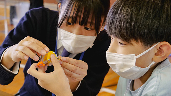 小学校で習う支点、力点、作用点の「てこの原理」の学習にもなります。力がいらず操作も簡単なので、子どもたちは組み立てた後、開いてブロックをつかんでは積み上げて楽しみました。早く作り終えた子が教える方に回るなど、児童同士が協力して進める姿が見られ、中には、愛着がわいたようで自分で作ったロボットへ名前を付ける子も。このパクパクハンドは小学生へお土産としてプレゼントしました。
