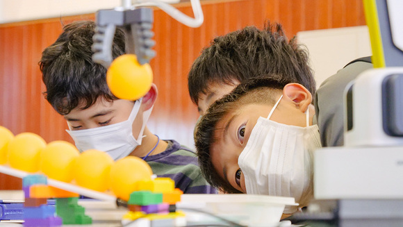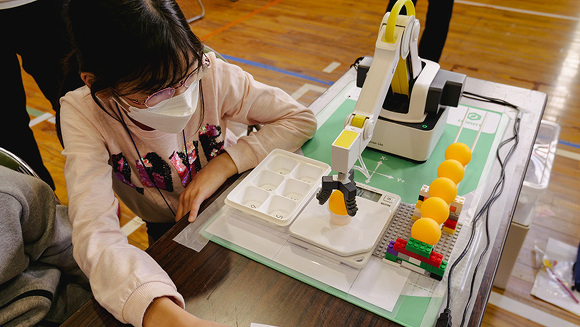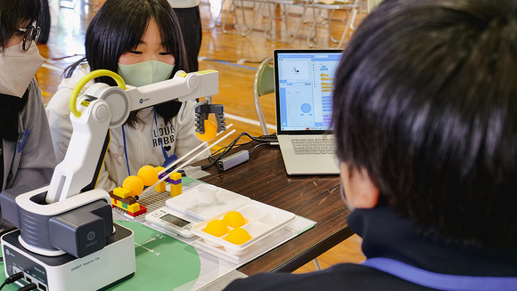 この授業で設定した課題は、教材用のモーター付きアームロボットをパソコンのプログラムソフト「スクラッチ」で操作し、ピンポン玉をつかんで運び、計量して箱に詰める作業です。