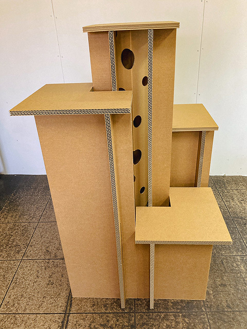 段ボール製キャットタワーの真ん中部分へ水玉模様に穴を開けた商品で、組み立て式なので、使わない時はコンパクトに収納できる点もメリットです。