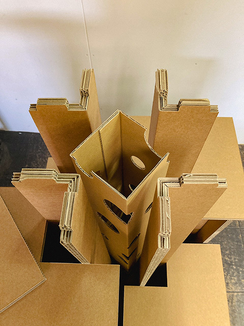 段ボール箱に加え、椅子や机、棚、インテリア用品など幅広い商品を作れる点が大きな特徴です。ディスプレイ事業では、スウェーデン製の「リボード」や強化段ボールなど、軽くて耐久性に優れた紙素材で商品棚などの什器を製造。木製に比べ、工具を使わず簡単に組み立て・解体ができ、運搬や設営、廃棄の点でも負担が少ないため、百貨店の催事や企業の展示会などさまざまな場面で活用されています。