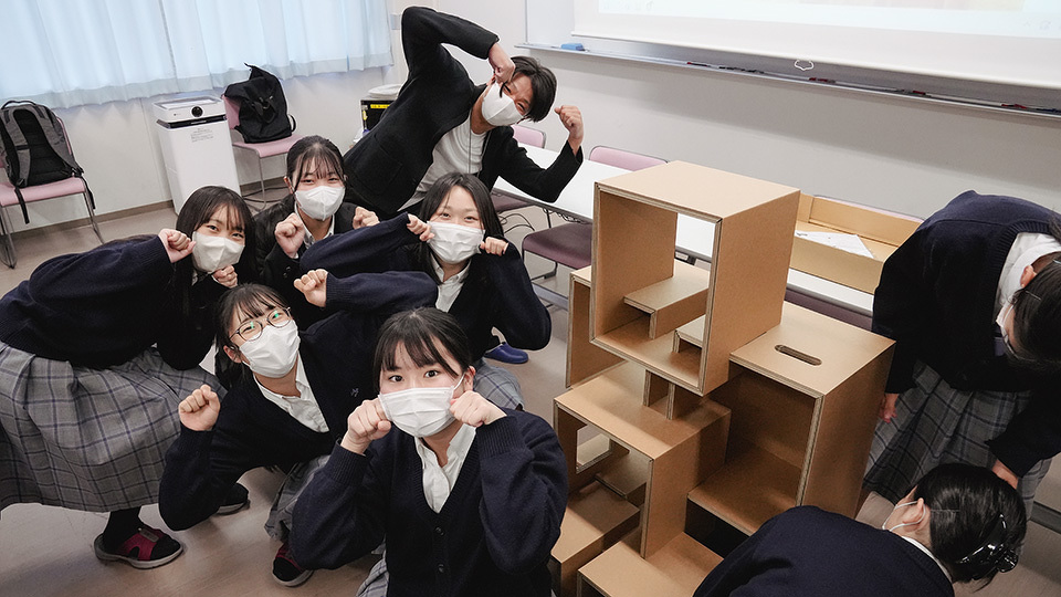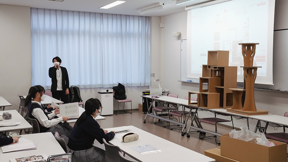 10月31日には同社の営業担当の方が来校し、事業や商品に関してお話ししてくださいました。フルオーダーやセミオーダー、インテリア用品やワークブースボックスなど一般向けに自社開発した「オリジナル」といった商品展開について説明。当日は学校へ段ボール素材のキャットタワーをご持参いただき、生徒たちは組み立て体験をしました。