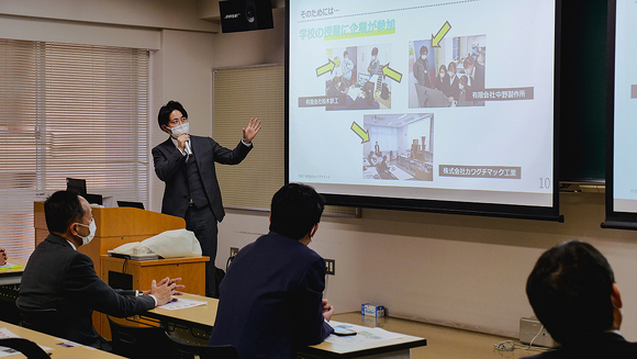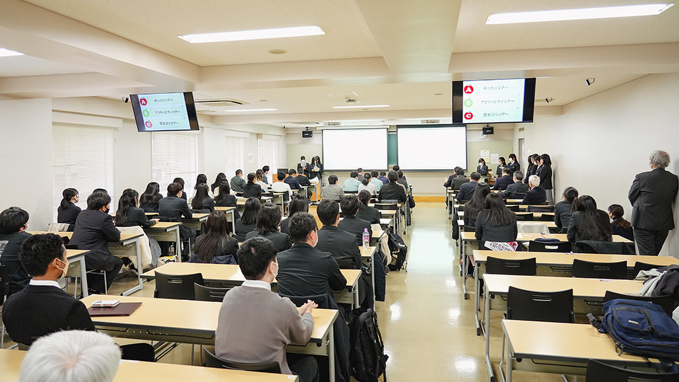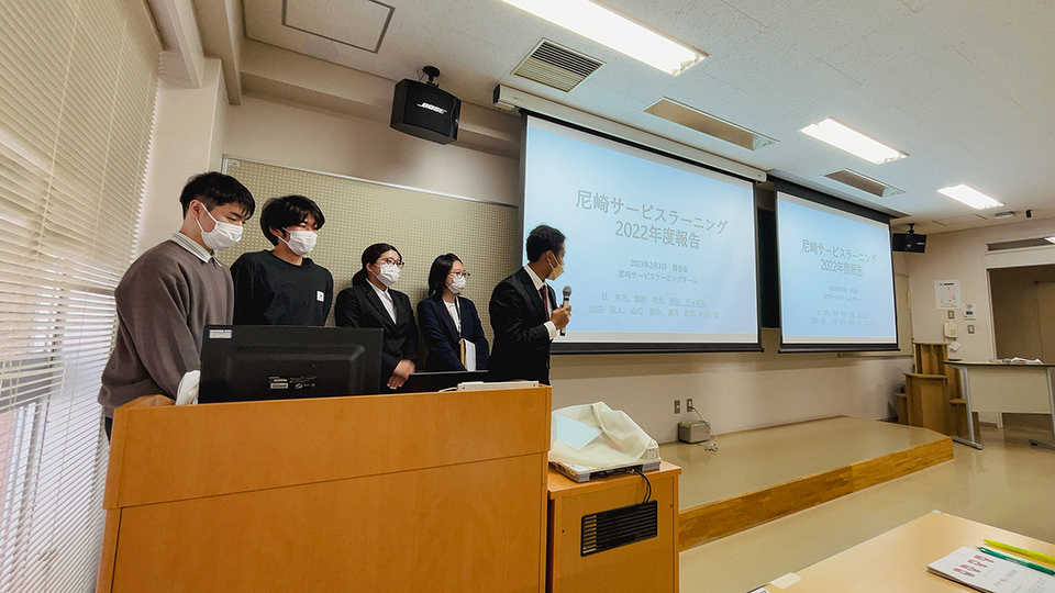 関西国際大学尼崎キャンパスで、2023年2月3日に「尼崎近郊での活動報告会 および 尼崎市 長期実践型インターンシップ報告会」が開かれました。