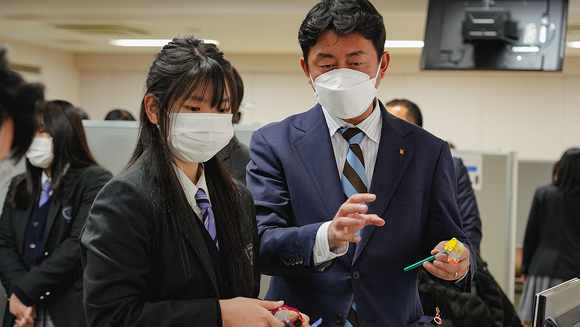・尼崎市立尼崎双星高等学校商業学科3年生のロボメイツ班、観光班、新商品開発班、先生方