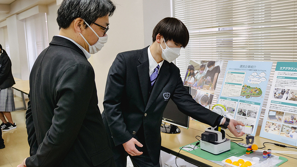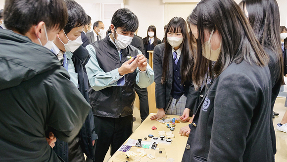 高校生が実際に開発した試作品や教材のロボットを来場者の皆さんに触って動かしていただいたり、授業の様子を撮影した動画を上映したりと、動きのある展示にしました。学生も来賓の皆さまも、笑顔で楽しく交流する場面が会場のあちこちで見られました。
