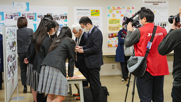 同大学の学生による発表はもう1件あり、「尼崎サービスラーニングチーム」がロボメイツをはじめ当社と連携した地域貢献、プログラミングイベント、田能の里いもに関するプロジェクトなどの活動について発表しました。