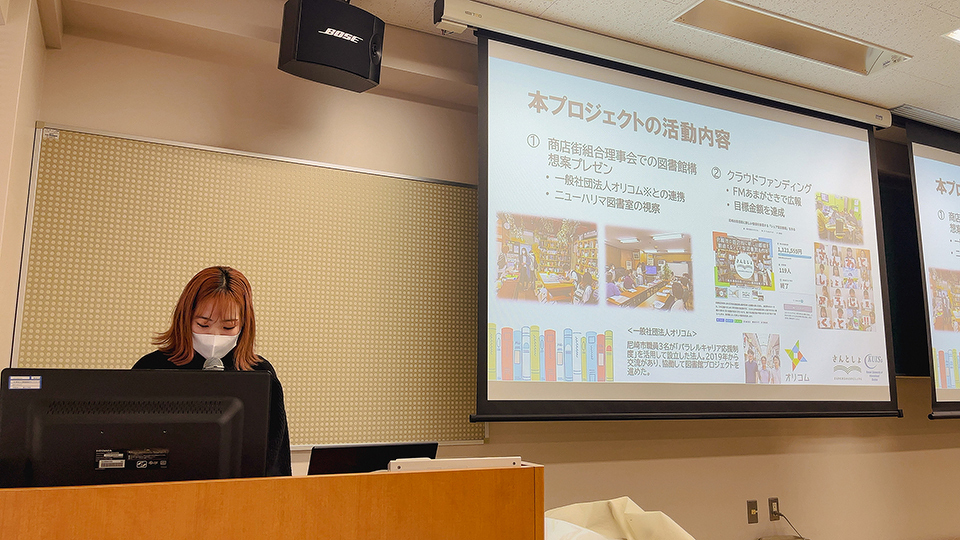 関西国際大学の学生からは、まず「シェア型図書館『さんとしょ~さんわにあるみんなのとしょかん~』プロジェクト」の発表がありました。
