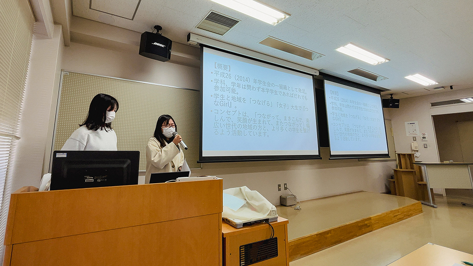 園田学園女子大学からは、学生地域連携推進委員会「つなGirl」のメンバー2人参加。「尼いも奉納祭」をはじめとする地域イベントへの参加やボランティア、自ら企画するイベントなど、尼崎での活動について発表しました。