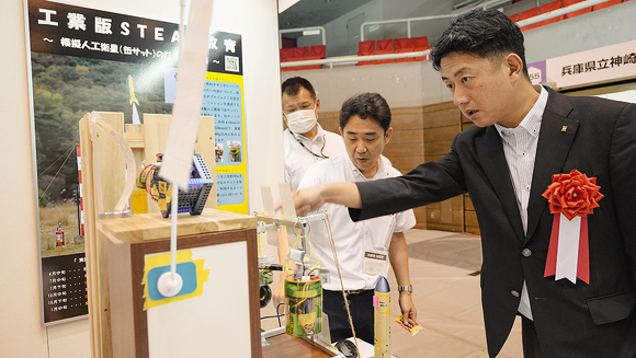 7月6日(木)、7日(金)に「あまがさき産業フェア2023」へ出展した尼崎双星高校のブースに参加し、生徒と行った後期課題研究の活動について紹介しました。ロボメイツの教材や授業の様子の動画、商品開発班が企業と共同開発した試作品などを展示し、来場者への説明も行いました。今後もこのような企業と学校をつなげる活動を進めてまいります。