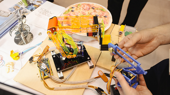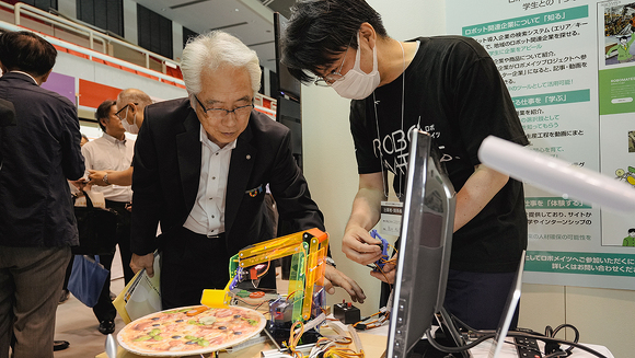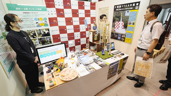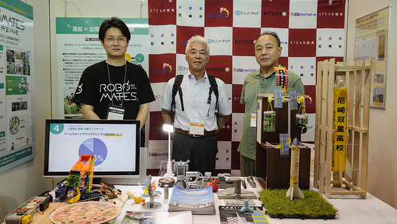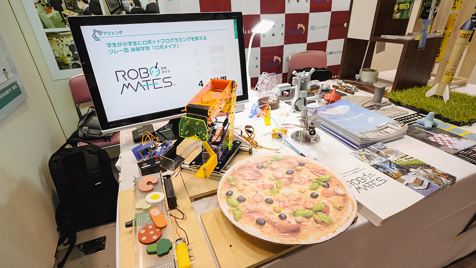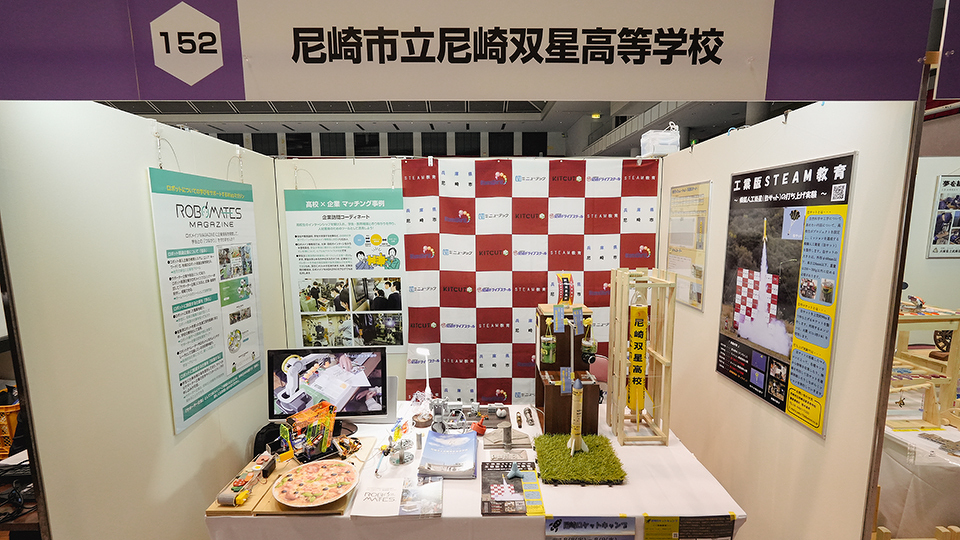ここに出展した尼崎市立尼崎双星高等学校のブースで、2022年度に後期課題研究の授業で生徒たちと一緒に行った活動を紹介させていただきました。ブースの一部で、ロボメイツのロボットなど教材の展示や授業の様子の動画上映などを実施。商品開発で作った試作品の展示も行い、当社代表の畠中とスタッフがブースを訪れた方々へ活動について説明しました。