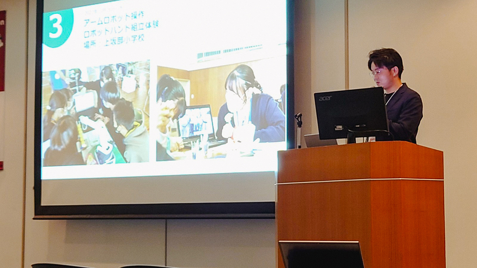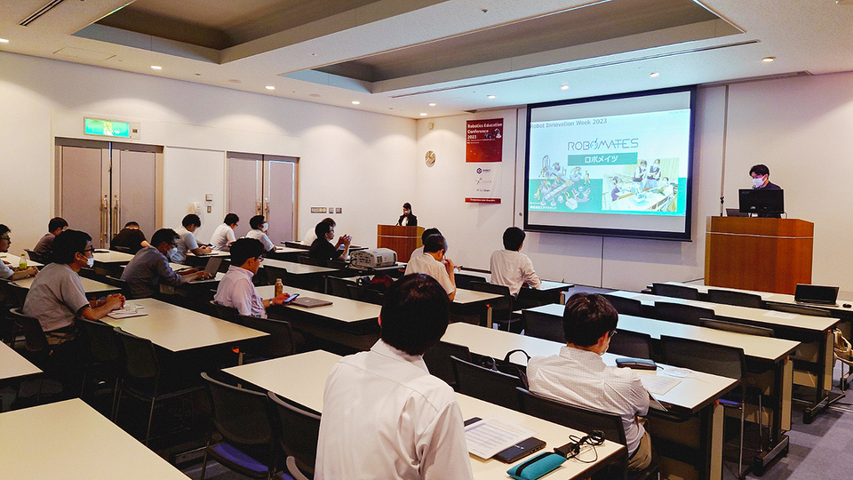 会期2日目はロボット教育をテーマにした「Robotics Education Conference 2023」が開催され、大学や高専の先生方に交じって当社代表の畠中も登壇しました。ロボメイツを中心に、当社の事業やロボットスクール開講に至る現状と課題について、スライドや動画を交えて話しました。
