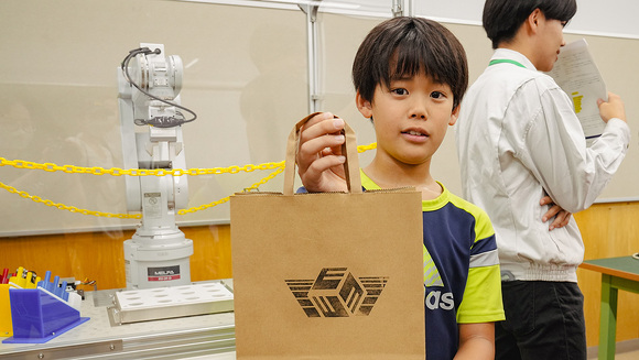 コンピュータ実習室で3Dプリンターを見た後に1つ目のパーツを受け取り、ロボット実習室では、産業用ロボットの実物を動かす様子を見てから2つ目のパーツを受け取りました。アームロボットがスタンプを持ち上げ、お土産用の紙袋へ角度を変えながら少しずつおしていって、マークを描き上げました。