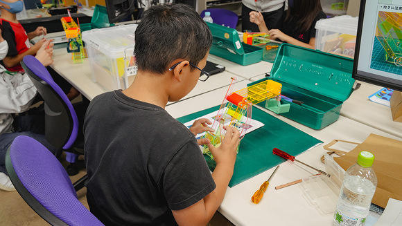 1人に1台が用意され、集めたパーツや工具、材料がそろっているかチェックをしたら、順番にねじ留めをして組み立て、動作確認するという流れで実施。高校生たちは、真剣なまなざしで取り組む子どもたちを見守り、様子を見ながら声をかけてやさしくサポートしていました。
