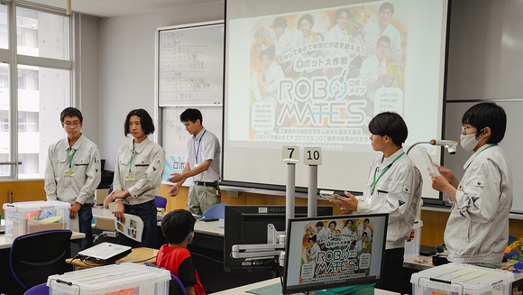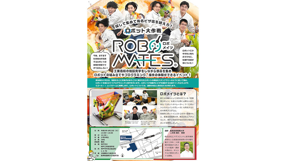 今年度(2023年度)より、産業用ロボットオペレーター育成プログラム「ロボメイツ」の一環として神戸市立神戸工科高等学校で授業を開始。その生徒たちが、学校見学とロボット体験を組み合わせた小中学生向けのイベントを企画し、8月22日(火)に「探して集めて有名ピザ店を超えろ!ロボット大作戦 ロボメイツ」を開催しました。