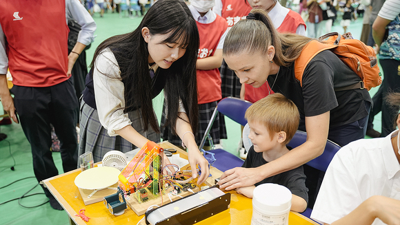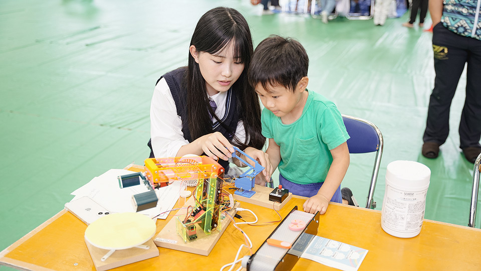 10月1日(日)、ロボメイツの活動で「尼崎市民まつり」に参加しました。尼崎市立尼崎双星高等学校商業学科の生徒たちがブースを出店。産業技術短期大学の二井見博文教授(電気電子工学科)やロボメイツスタッフと一緒にワークショップを実施しました。小学校での授業を控えた高校生たちにとって、今回のイベントは、初めて実際に子どもたちに教える機会となり、やさしい話し方やわかりやすい伝え方などを学ぶ貴重な経験ができました。