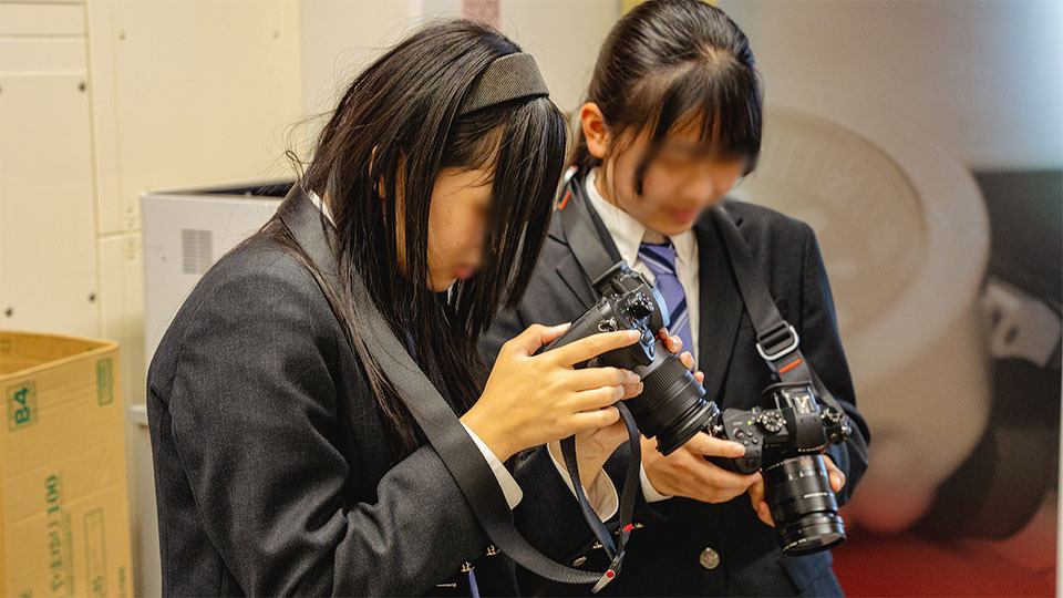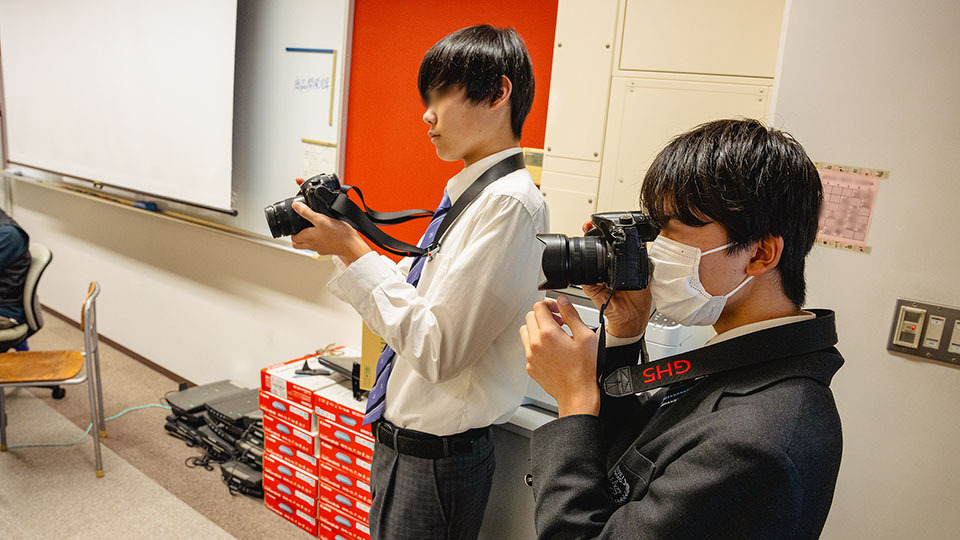 社内や屋外で練習。カメラを初めて触る生徒が多く慣れないながらも、表情や作業風景など撮りたいものを絞って考えながら撮影できました。