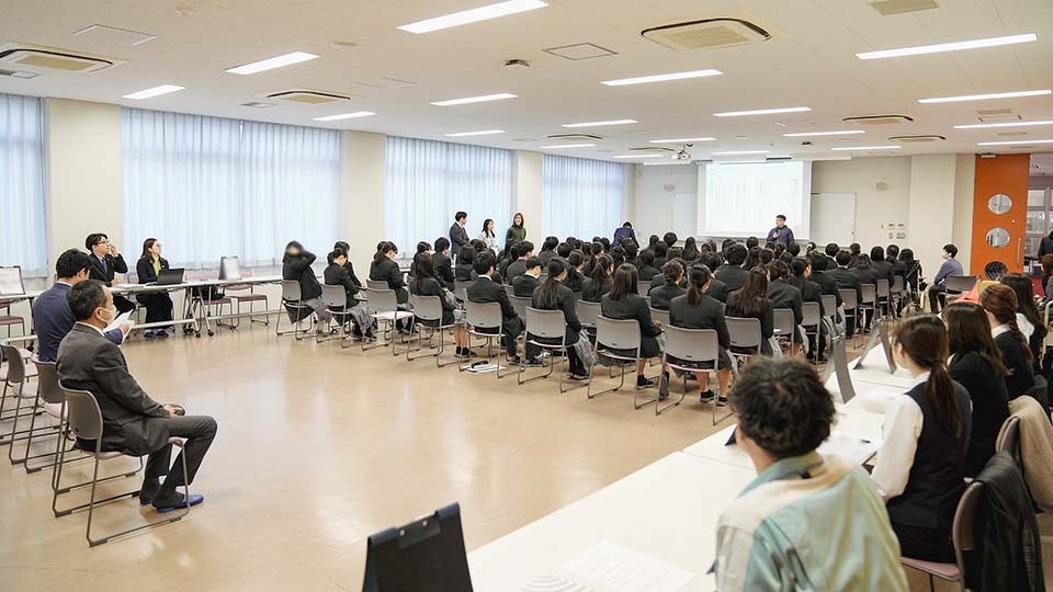 尼崎市立尼崎双星高等学校では、2023年9月から商業学科3年生の長期インターンシップがスタートし、11月には商業学科1年生を対象にキャリア教育イベントとして「出張講座」を実施。そして今回、2月13日(火)に商業学科2年生約70人と尼崎市内にある企業4社が参加して出張講座を行い、来賓として尼崎市長、副市長が来場しました。