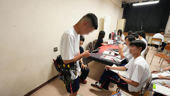 さらに、製品の実物や道具、機械を持ってきていただいたことで、よりリアルに事業内容が伝わりました。有名テーマパークや普段買う食品、生活に密着した公共設備など、身近なキーワードに生徒たちの目がキラリ。また、仕事道具を実際に身につけたり触ったりする体験もでき、楽しみながら理解を深めることができました。