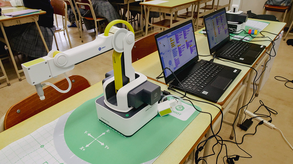 今回の授業で使ったのはアームロボット教材で、机の上に置ける小型サイズながら産業用ロボットを模した本格的な仕様です。スタッフがパソコンのソフトでプログラミングした「移動して小さなブロックをつかむ」指示を、ロボットは忠実に遂行していきます。