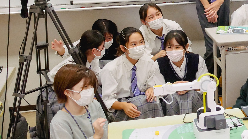 高校生たちは初めて見るアームロボットに興味津々。「小さい!」「音が静か」「スムーズに動く」と驚きながら作業を見学し、実際に触ってみました。