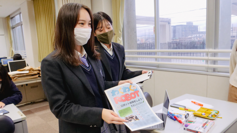 生徒たちはイベントで小学生に体験してもらう内容を考えるだけでなく、宣伝チラシ制作、動画制作、司会と台本の作成、写真撮影の4グループで役割分担をしました。さまざまな役割があるので、例えば「ロボットにはあまり興味がないけれど、動画は好き」という生徒も楽しんで取り組めます。