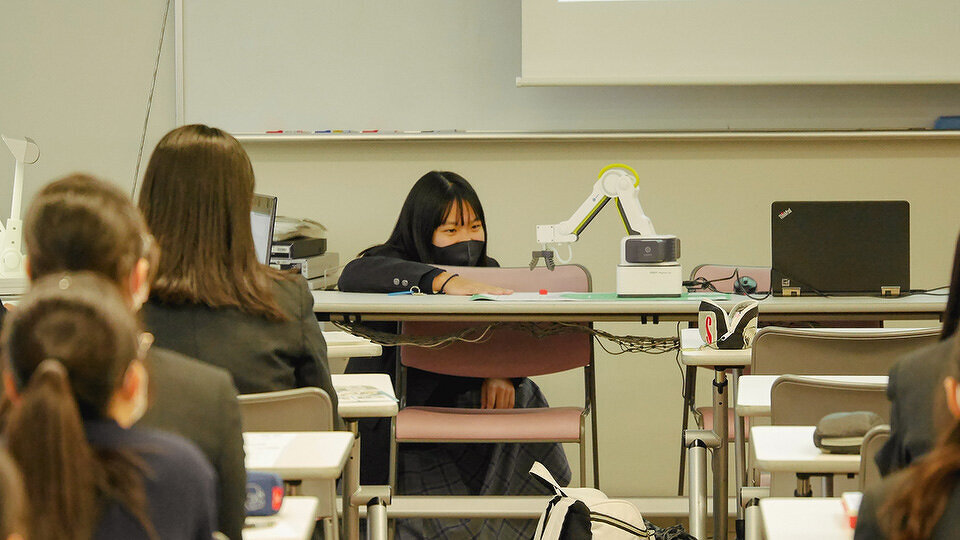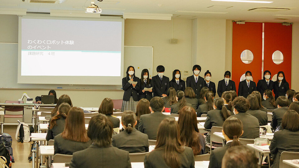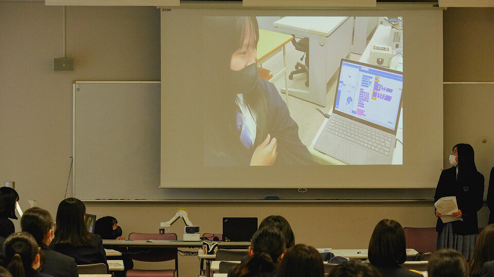 2021年12月に開かれた校内の課題研究中間発表会で、9月から3か月の取り組みや今後の予定について発表しました。わかりやすくまとめるため、プロのクリエイターから習った知識や技術を生かし、PowerPoint(パワーポイント)を使って文章や写真、動画を組み合わせたスライド資料を作成。司会から聴衆への呼びかけやロボット操作の実演を交えるなど、工夫したプレゼンを行いました。