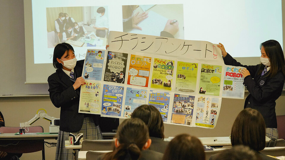 この班はロボットの実機を登場させたり、全員それぞれチラシをつくって一般の方に見せて感想を聞くなど、他の班と一風違う発表や活動内容だったため、発表会を見に来た先生方からはどよめきが起こりました。