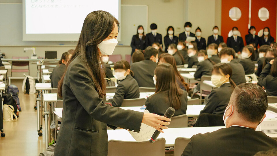 2021年12月に校内で3年生全員が一堂に会し、9月から6つの班に分かれて行ってきた「課題研究」の成果を伝える発表会が開催されました。