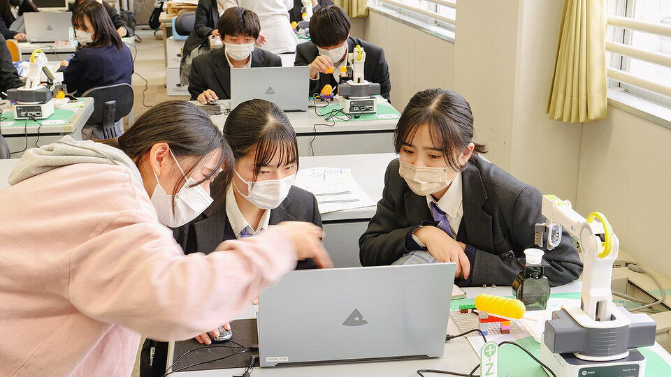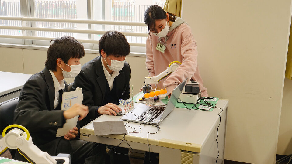 この体験プログラムは、後日、形を変えて実現しました。2022年2月3日、尼崎市立琴ノ浦高校で「アームロボット講習会 ロボメイツ」を開催。「みかんまんじゅう製造工場」のストーリーを生かし、高校生向けにより実践的な内容にしてアームロボットオペレーター体験の授業を行ったのです。