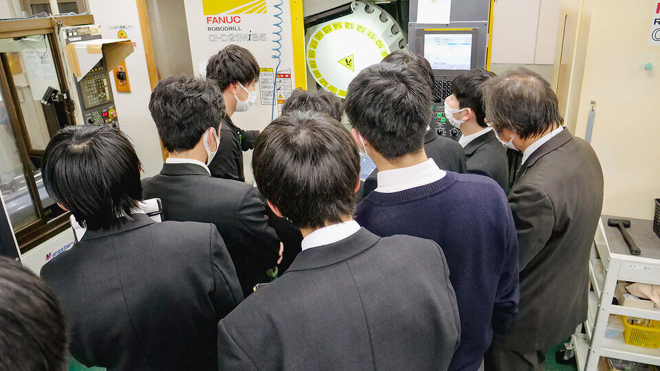 部員は工場長さんへの感謝とともに、「実際に加工を仕事とされている方からアドバイスをいただけてとても嬉しかった。今までは樹脂を使用して制作していたが、金属で加工された物を実際に見ると感動した」と話し、喜んでいました。同部顧問の藤井先生は長年にわたり教員をなさっており、実はこの工場長さんの高校時代をご存じだそうです。こういったところにも地元企業ならではの縁を感じます。