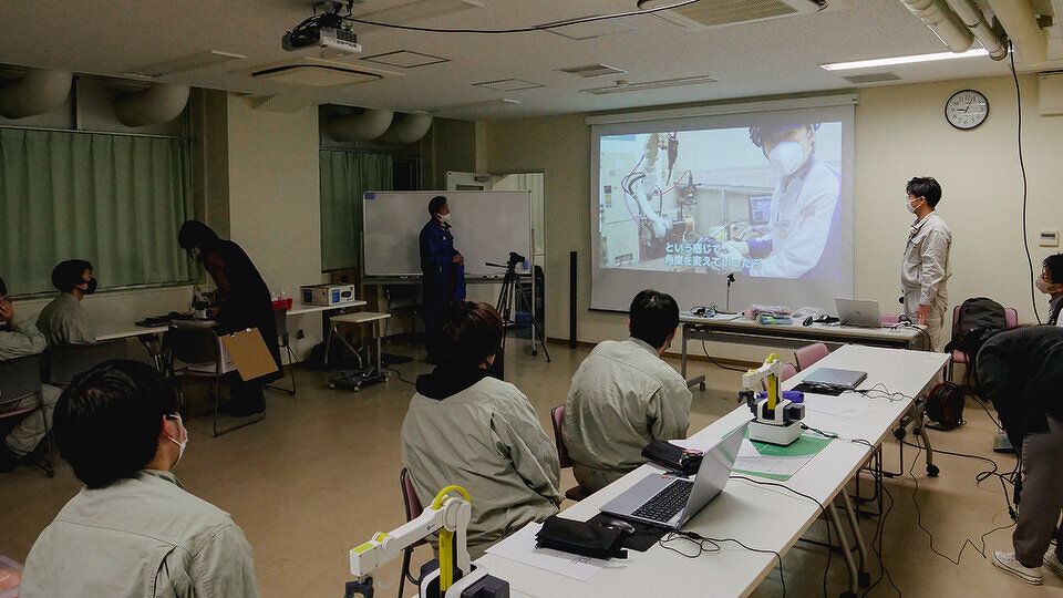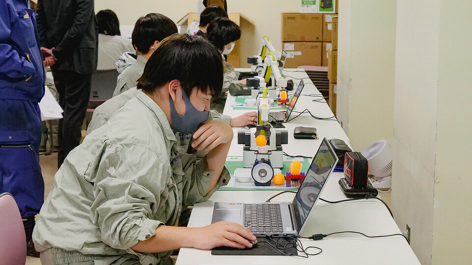 私たちは2022年2月、産業用ロボットオペレーター育成事業「ロボメイツ」の一環として、同校で「アームロボット講習会」を実施しました。この講習を受けたのは、工業機械系列2年生15人です。