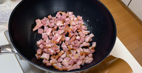 1.フライパンにオリーブオイルを入れ、弱めの中火でベーコンを炒めます。