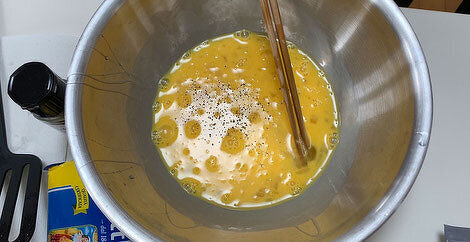 2.卵をボウルで混ぜて、塩とコショウを少し加えます。