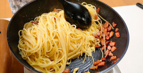 5.パスタがゆで上がったらザルでお湯を切り、ベーコンを炒めたフライパンに入れます。火を最小限に抑え、溶き卵を加えながら混ぜます。火が強すぎると、卵がオムレツになる危険性があります。