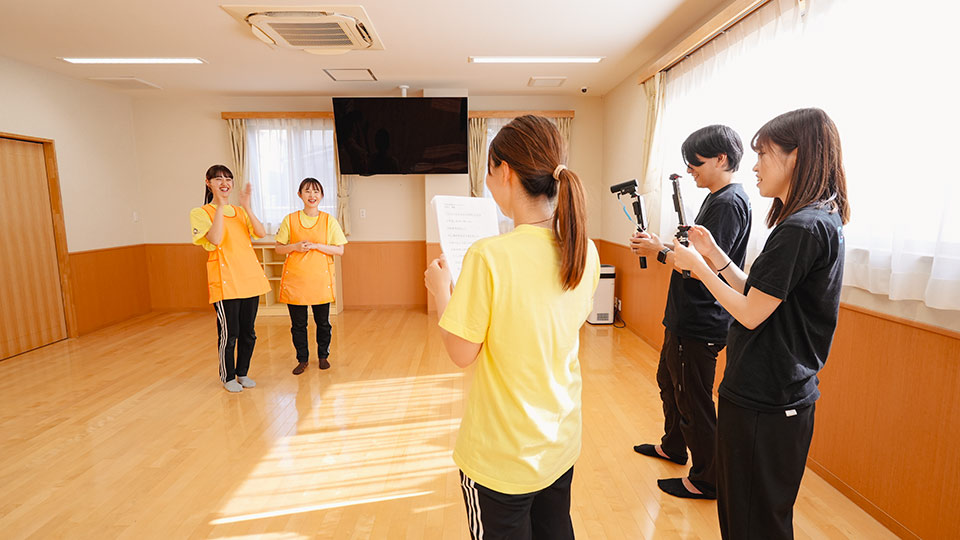 学生とSNSショート動画をつくるプロジェクト「ガクツク」を展開する当社では、大学生インターンの自由な発想とスタッフのプロの技術で動画を制作します。同年代の学生に見てもらうためにSNSの人気コンテンツなどを分析して企画に取り入れ、「ここで働きたいな」と感じてもらえるよう、園の魅力を若い人の興味を引くポップな切り口で伝えます。