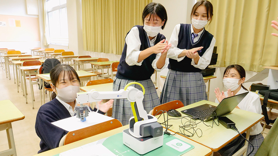 大学生インターンの皆さんはまず、高校の実習授業の教材となる「アームロボット」を使えるようプログラミングを学びます。未経験でも簡単にできる教材です。