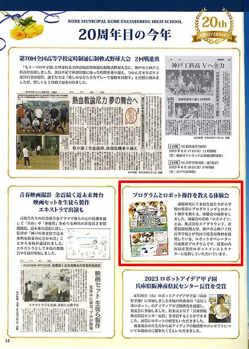 神戸市立神戸工科高等学校が2023年4月に創立20周年を迎え、このほど、記念誌を制作しました。この誌面で、当社と共同で取り組む産業用ロボットオペレーター育成プログラム「ロボメイツ」の教材開発、同校で開催した体験会「ロボット大作戦 ロボメイツ」について、紹介してくださいました。