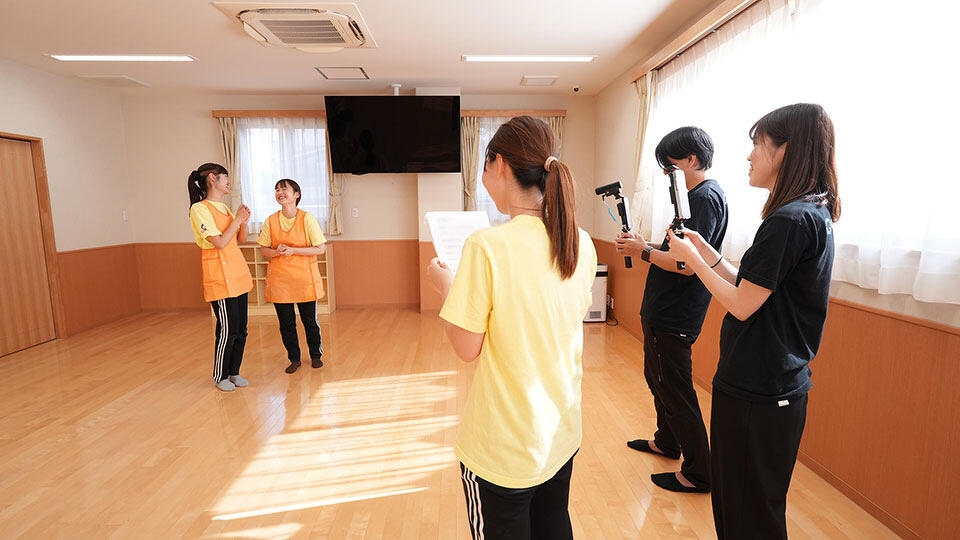 SNSショート動画は月に何本と定期的に公開することから、効果の分析や改善、次につなげるまでがスピーディーです。「お任せ」ではなく、お客様とコミュニケーションを密にとり、動画を共につくり上げる「チーム」で進めています。撮影現場では、出演する職員の方々がリラックスできる雰囲気づくりを心がけています。学生がアシスタントで加わることもあり、和気あいあいと撮影が進みます。